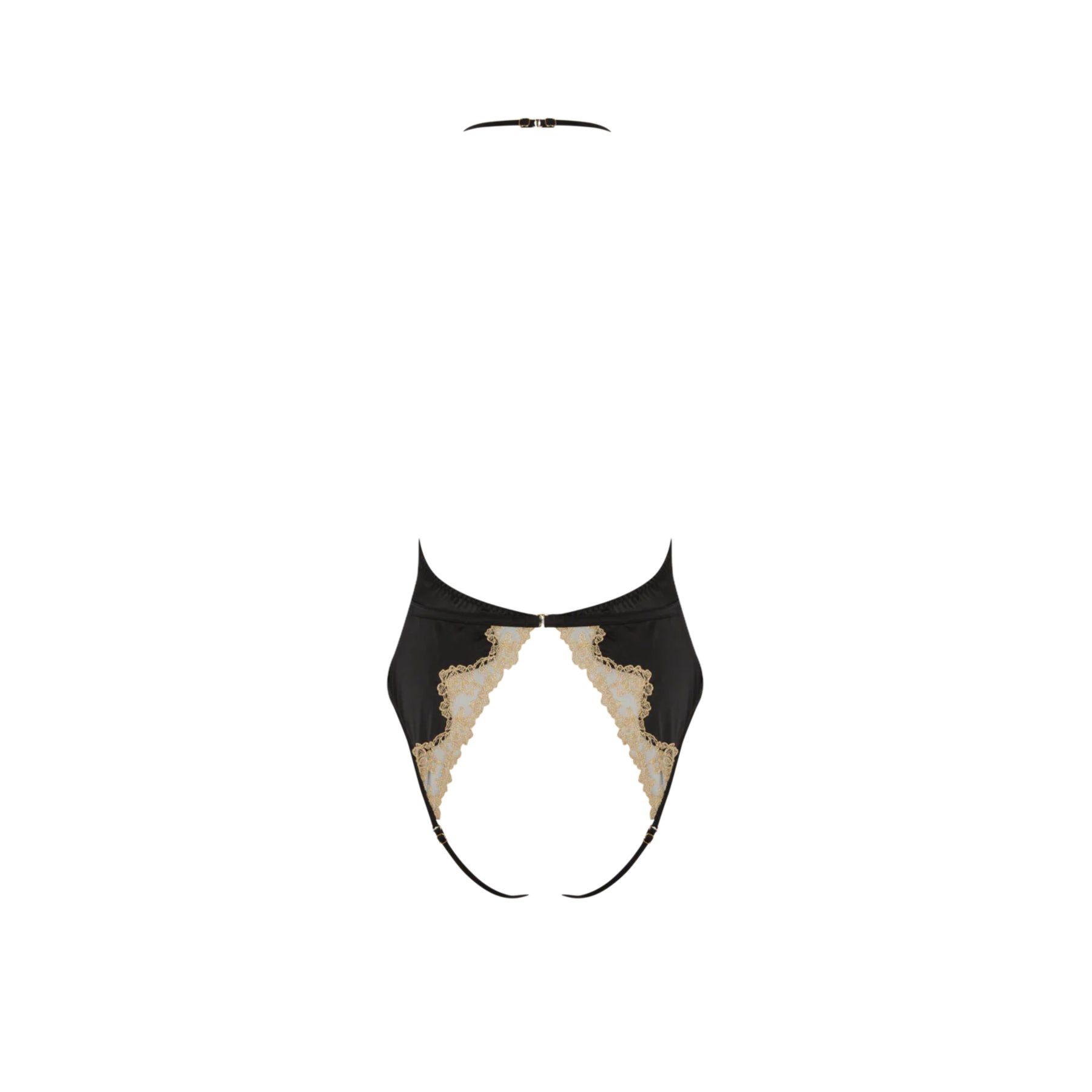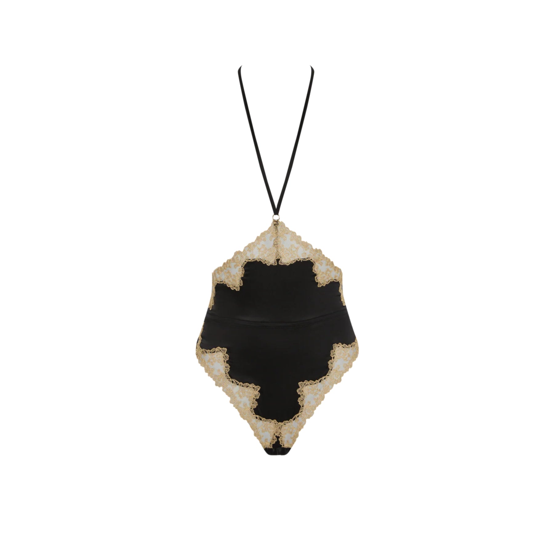Le sottili spalline in seta nero corvino si incontrano tra il seno e raggiungono le spalle, mentre il ricamo smerlato e i divini pannelli in seta avvolgono il busto, regalando una sensazione fenomenale quanto il suo aspetto. La delicatezza del capo è completata da una cintura rivestita in seta che stringe la vita, prima di passare a un design a mutandina aperta con bordi in seta. Sul retro, le natiche sono incorniciate da ricami smerlati decorati. Il capo è completato da spalline regolabili in seta, delicati dettagli dorati e un gancio a cigno regolabile nella parte bassa della schiena.