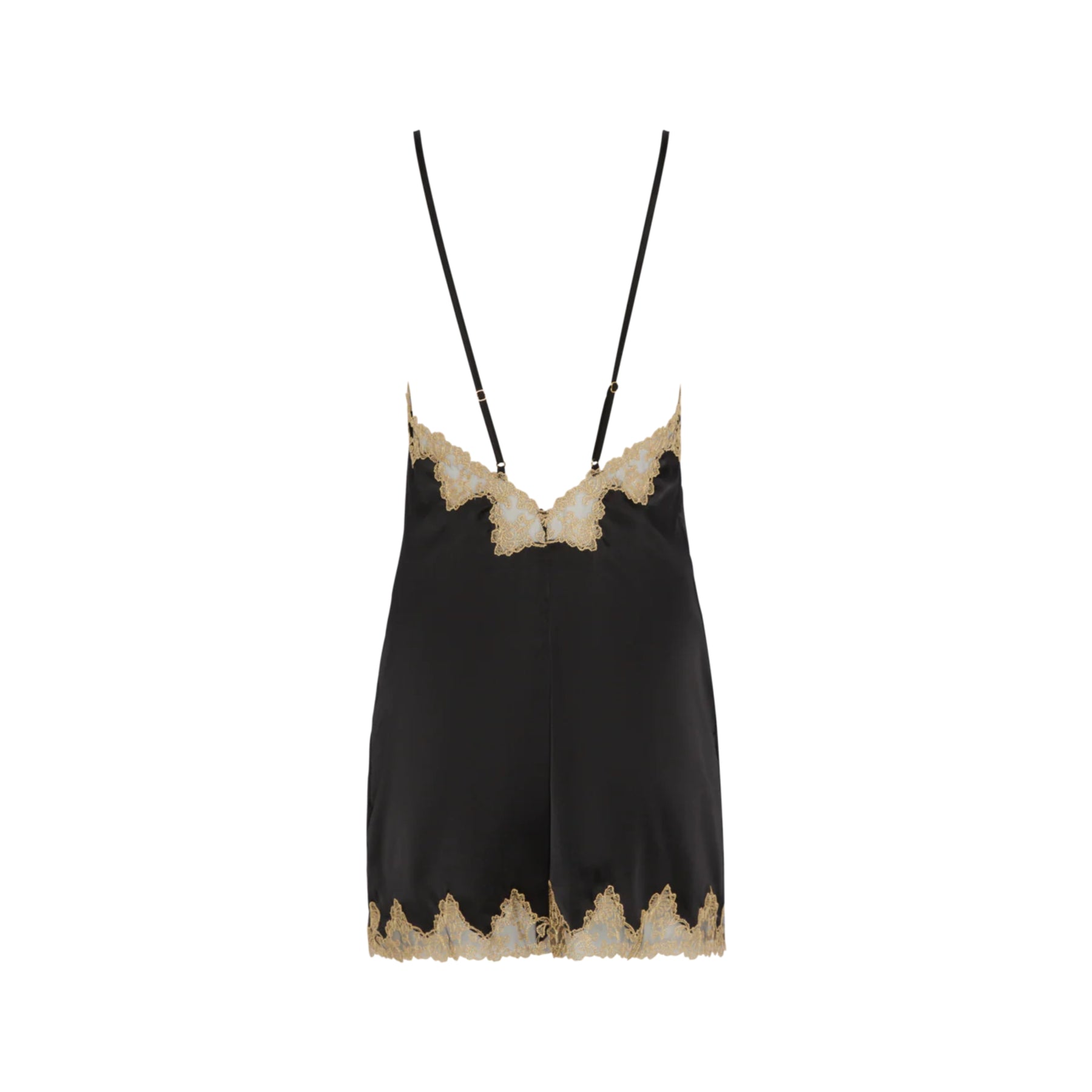 Le spalline regolabili in seta incorniciano un scollo profondo sulla schiena, che si posiziona perfettamente al centro della colonna vertebrale. Semplici dettagli dorati aggiungono un tocco finale di lussuosa maestria artigianale.