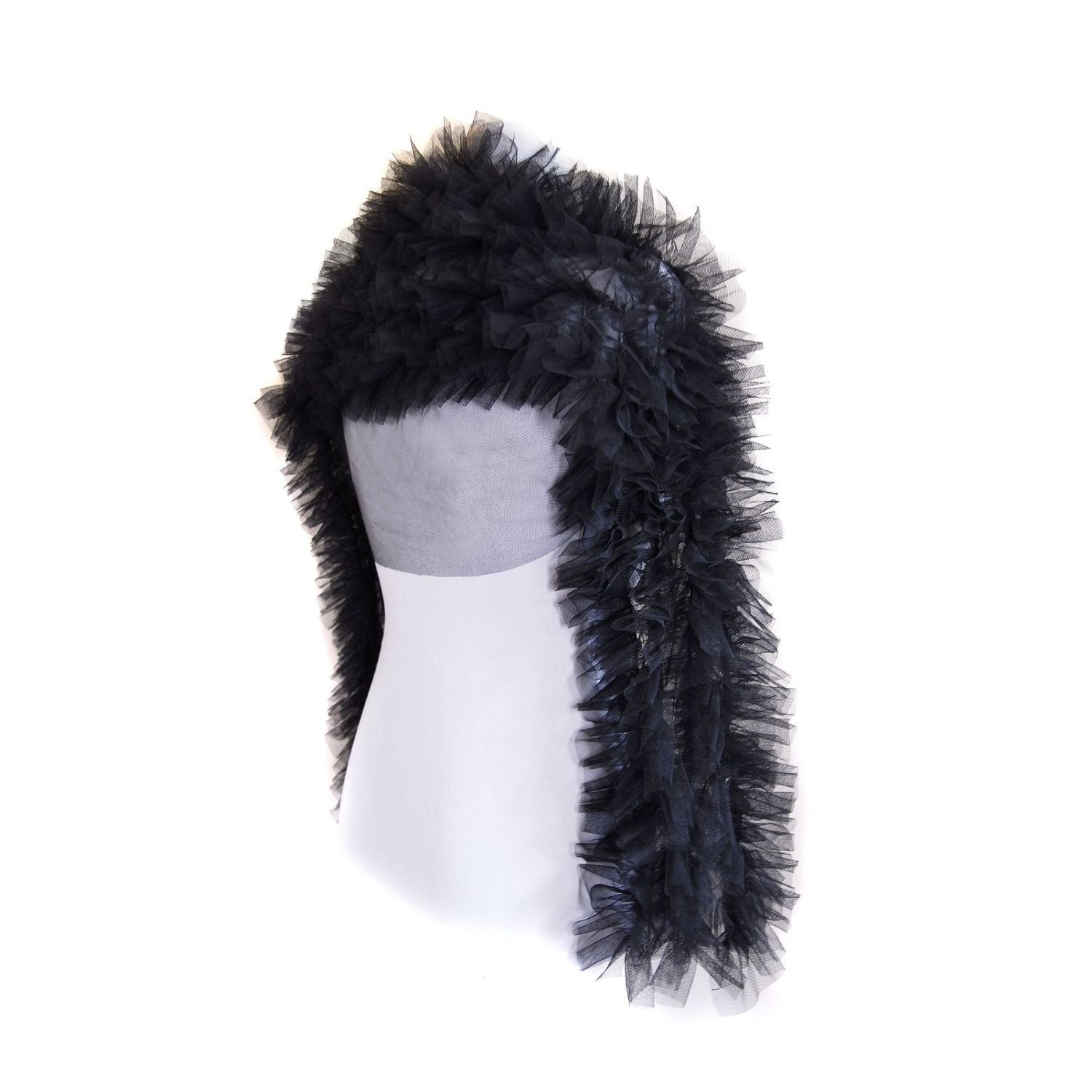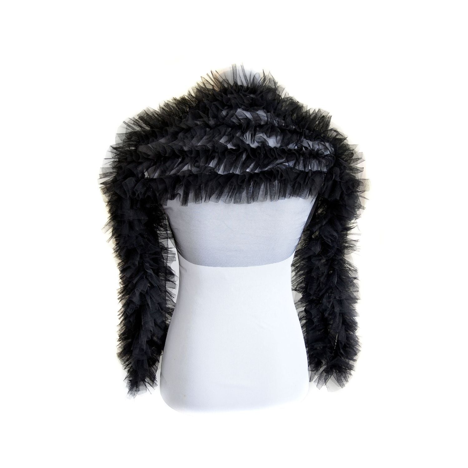 Giacca leggera e vaporosa in stile bolero, realizzata in rete nera parzialmente arricciata.