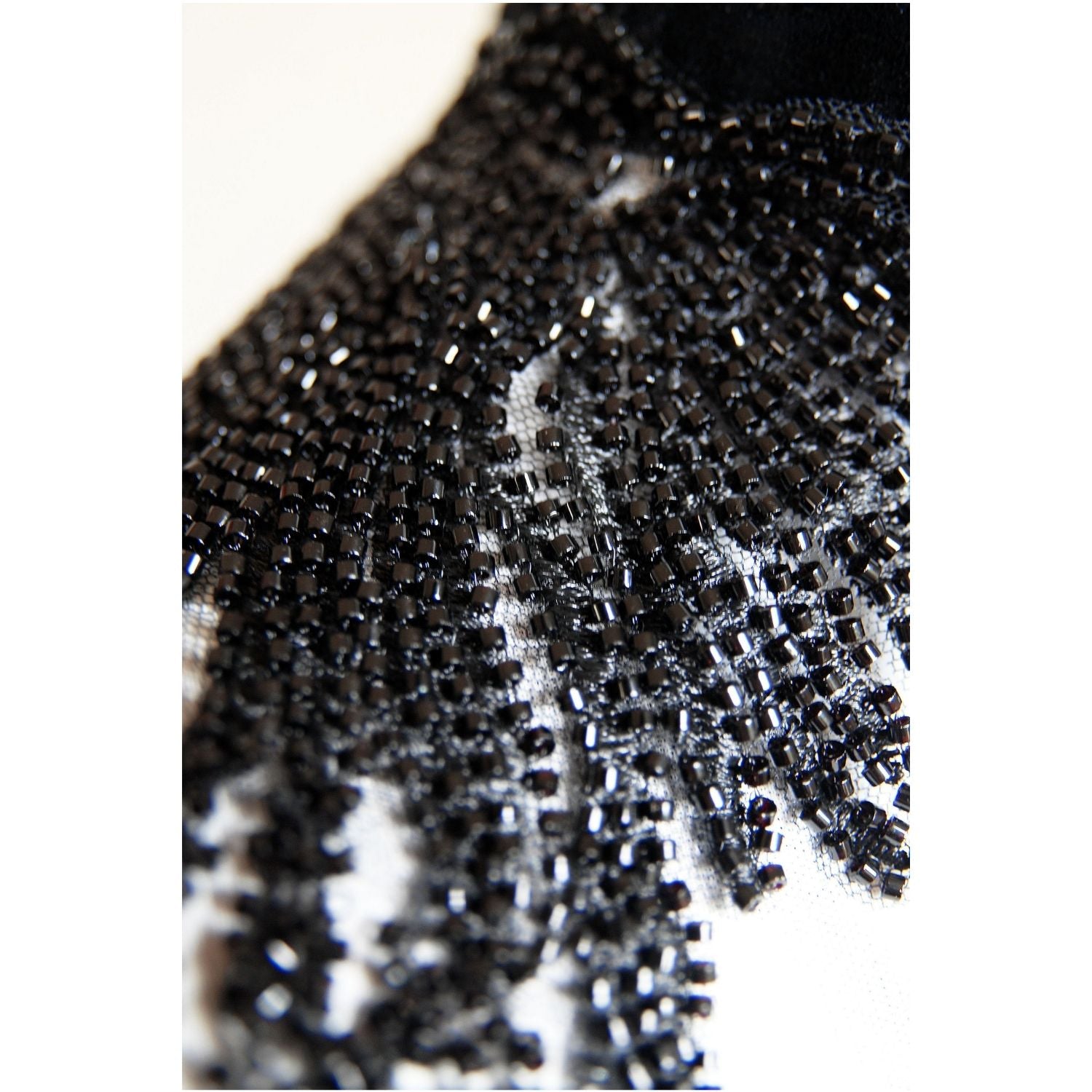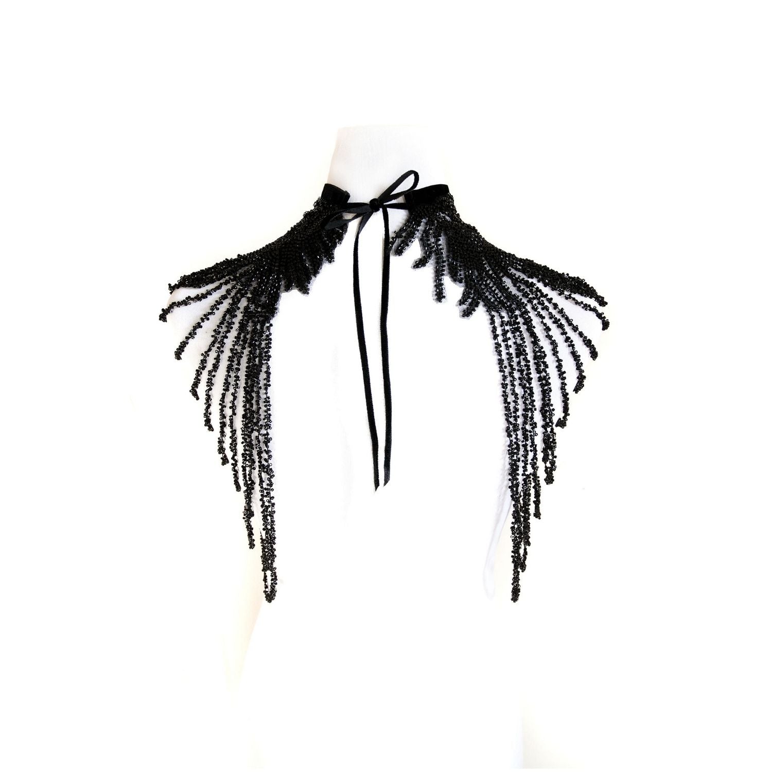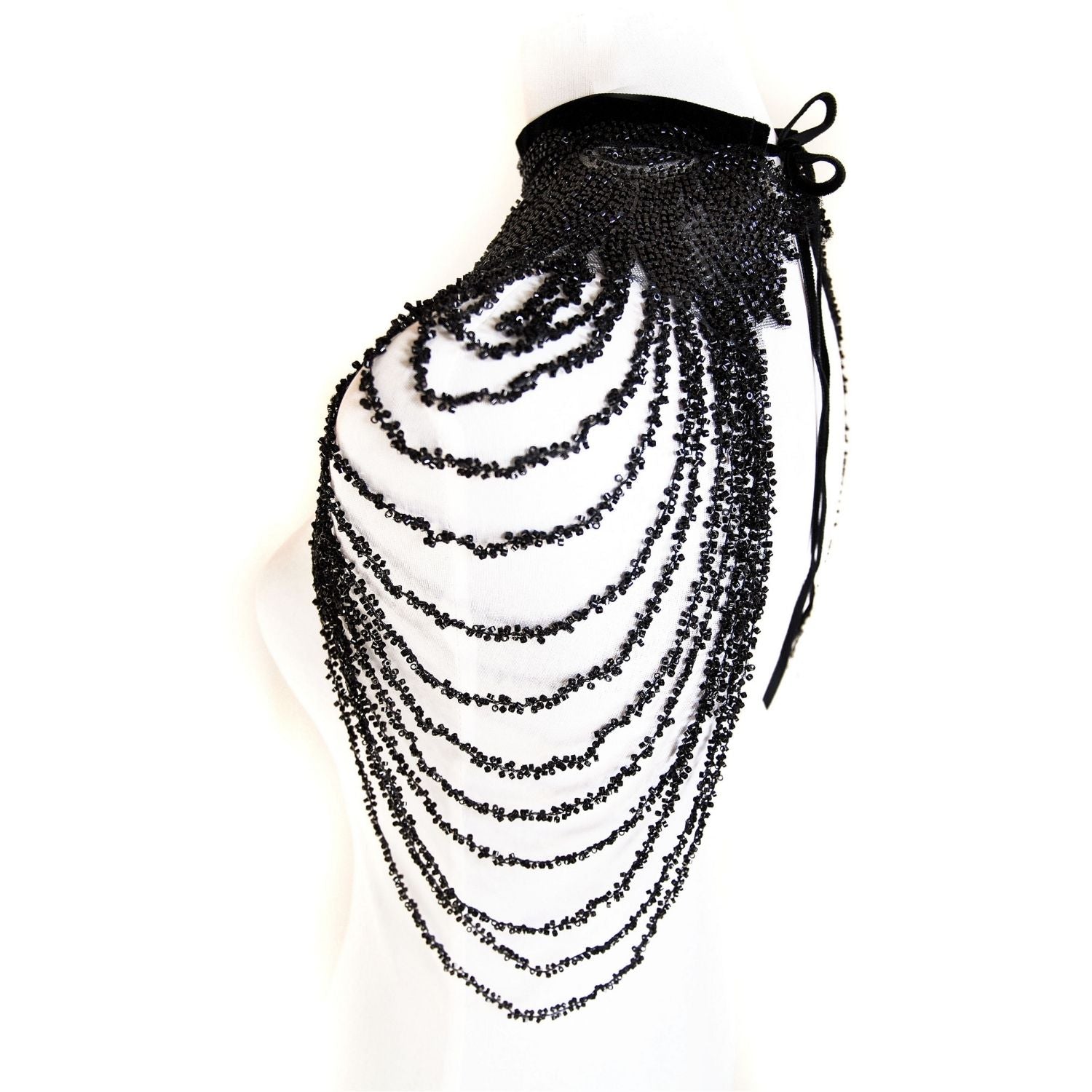 Gioielli per il corpo realizzati con applicazioni di perle nere che ricadono leggermente sulle spalle e sono fissate a un girocollo di velluto. La chiusura con fini nastri di velluto.
