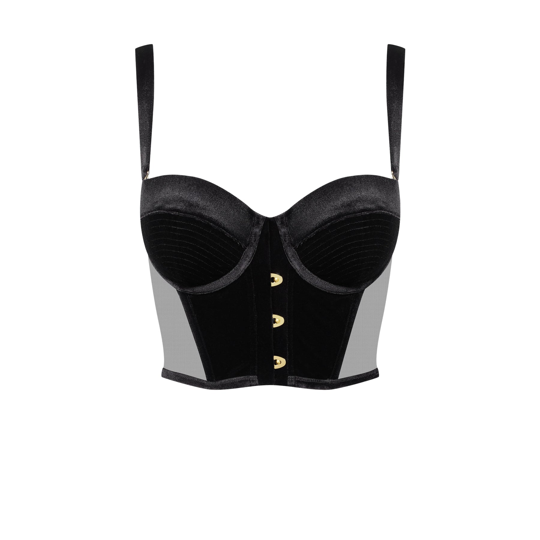 Le coppe sono rivestite in velluto impunturato, in contrasto con un tulle ultra trasparente sui lati, che disegna linee decise lungo il busto. Sul davanti, una placca metallica con gancetti dorati chiude il bustier come un capo di corsetteria.
