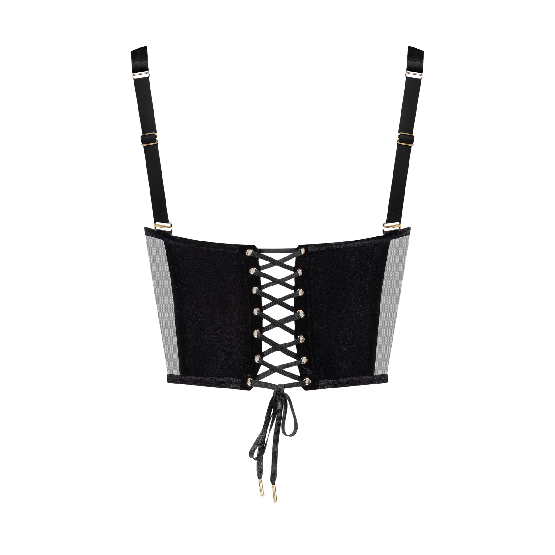 Le spalline larghe, rivestite in velluto sul davanti, sono regolabili e amovibili per modulare la vestibilità. Sul retro, un’allacciatura regolabile, arricchita da occhielli dorati e terminali gioiello, permette di stringere il bustier a piacere. Un bustier di lingerie prêt-à-porter, pensato come un’architettura del desiderio, da indossare sotto una camicia o da mostrare liberamente.