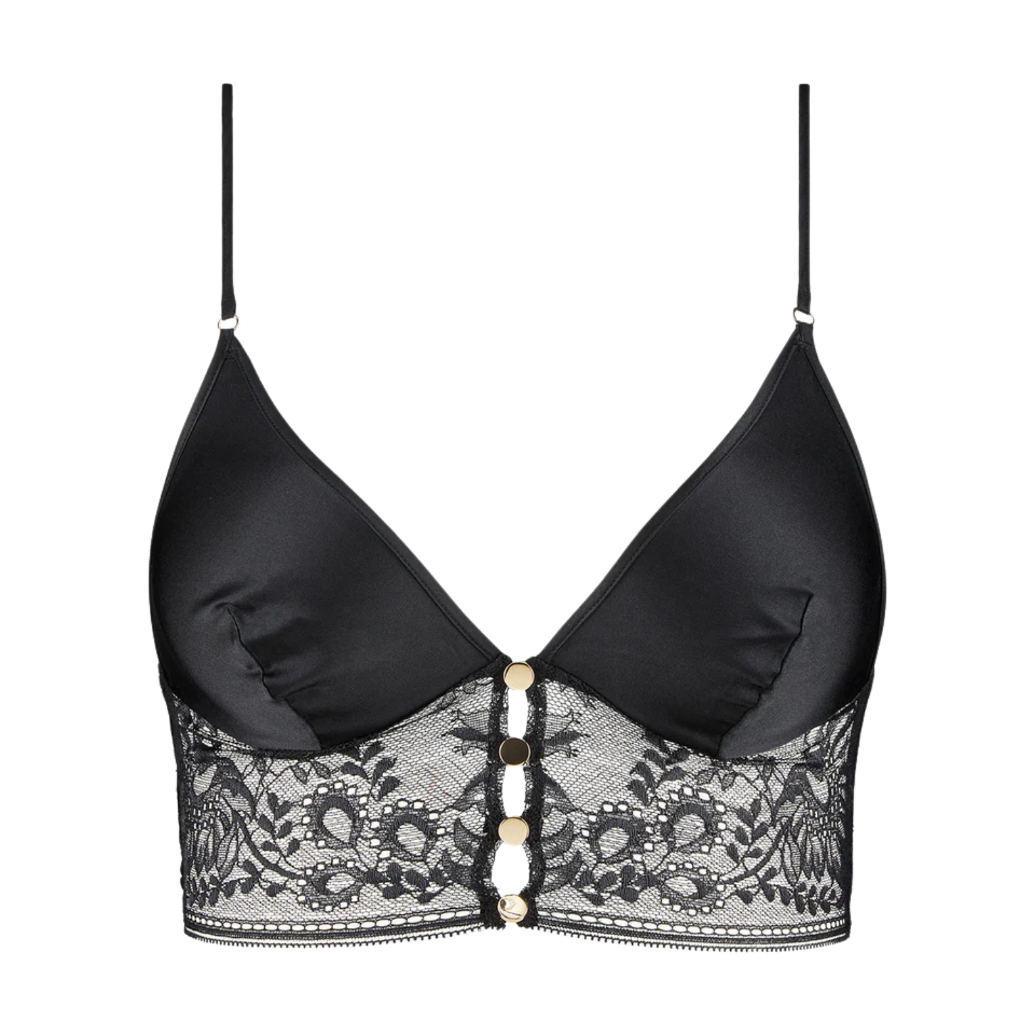 Un triangolo sfoderato che combina seta e pizzo, impreziosito da bottoni dorati.