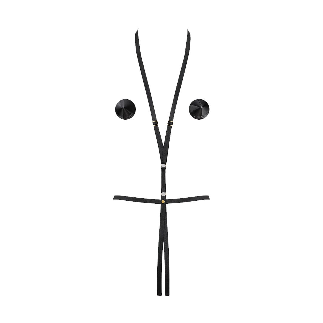 E per un tocco di fantasia, due copri capezzoli neri accompagnano l'imbracatura.
