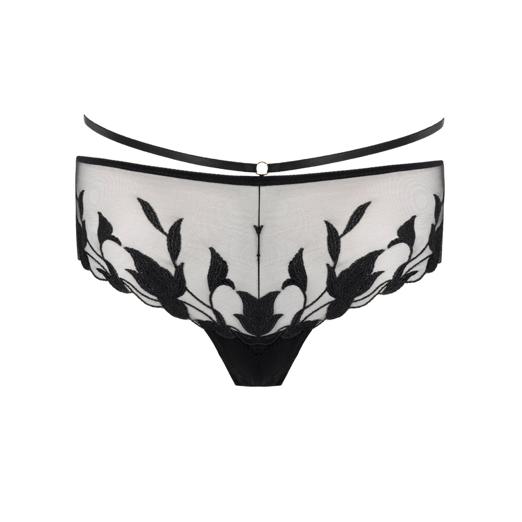 Back coverage: minimal Waist: elasticated Inner fabric: 100% cotton Transparent tulle Golden studs French Lycra® embroidery Satin and crossed elastics Guipure braids