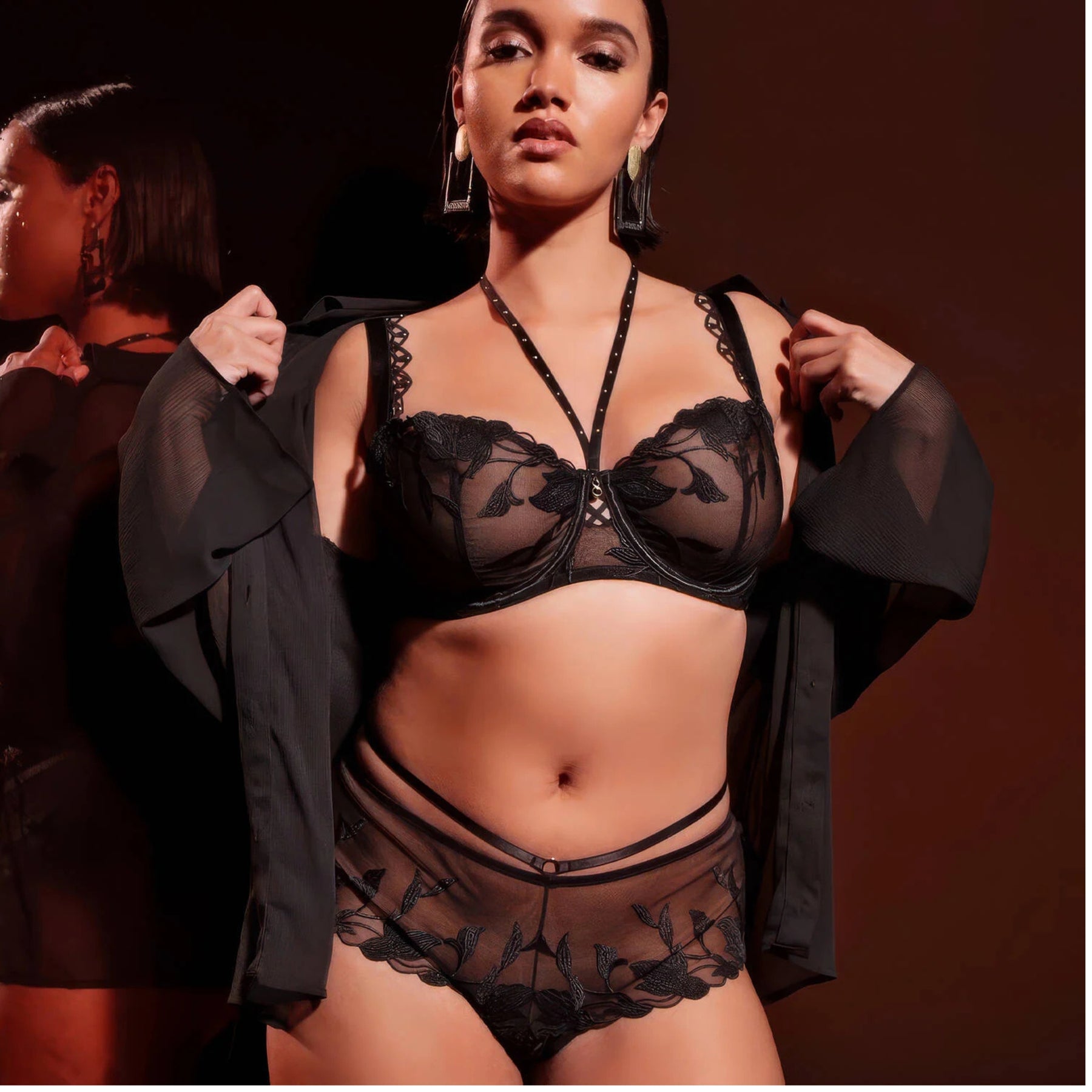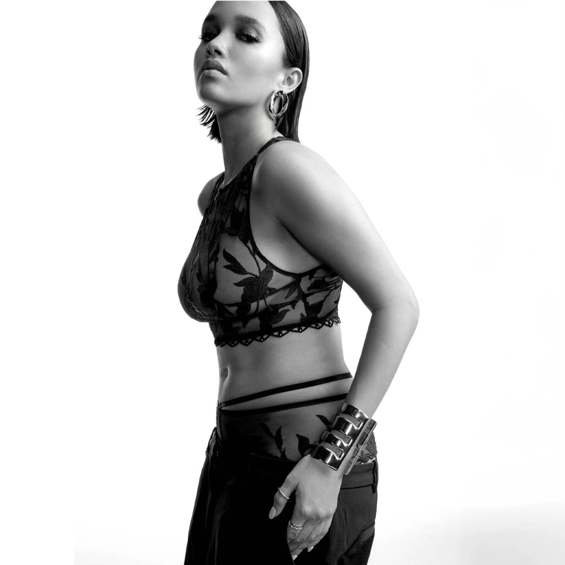 Charming thanks to its comfortable and modern cut, the Night At Paradise culotte showcases a sophisticated floral embroidery on the hips. Sexy, a bondage-style strap detail highlights the waist and transforms, at the back, into a play of laces that reveal the curve of the back for a subtly erotic silhouette.