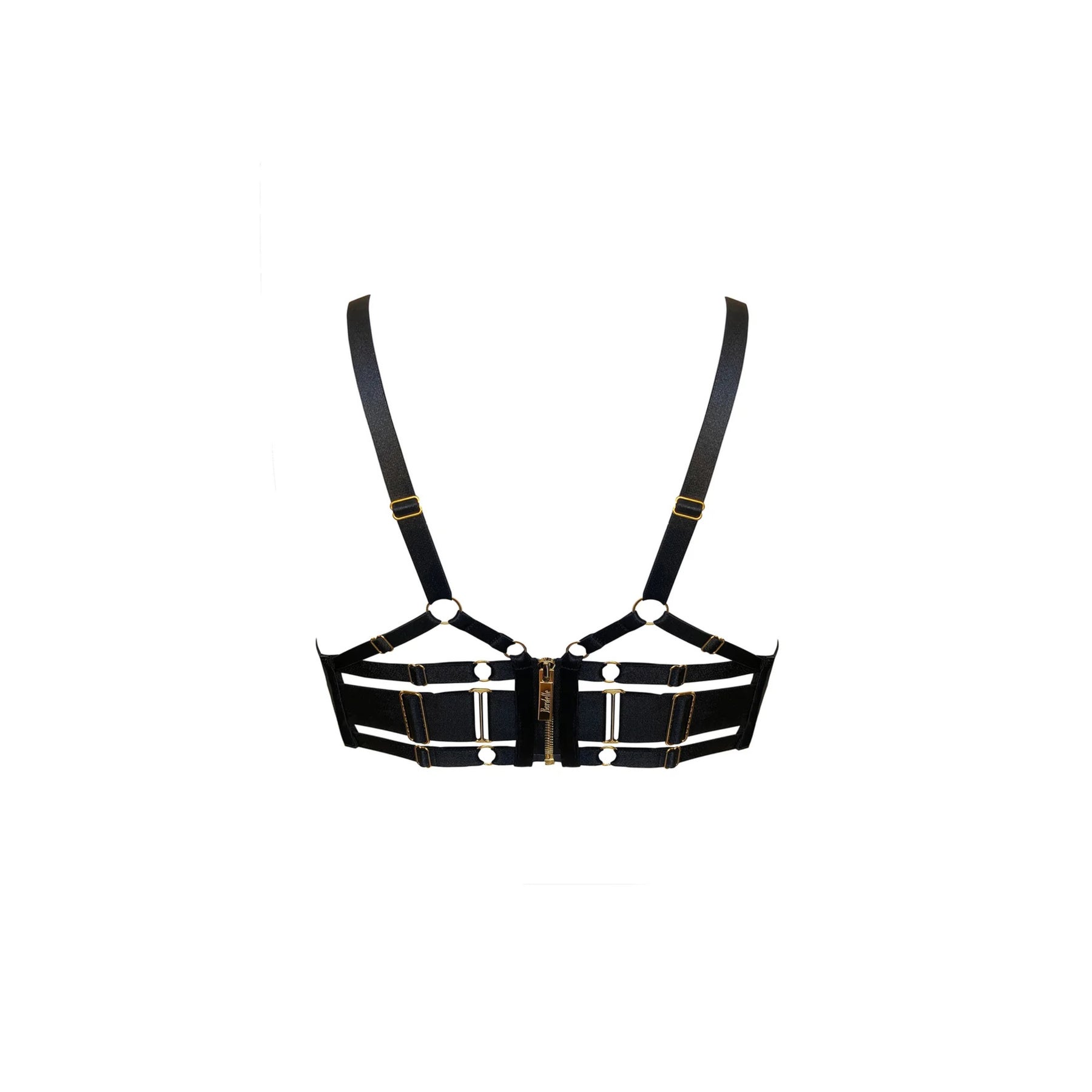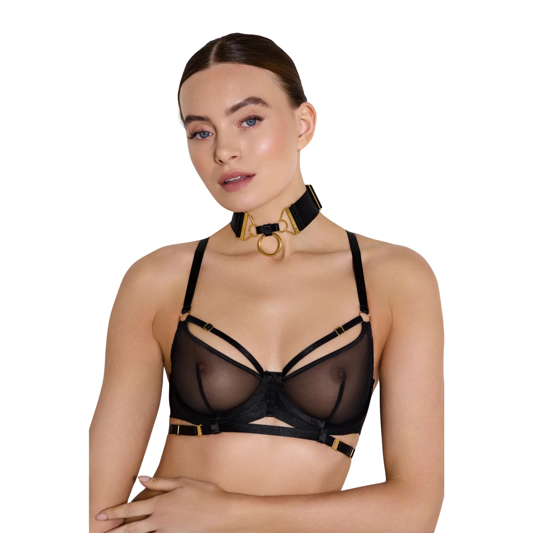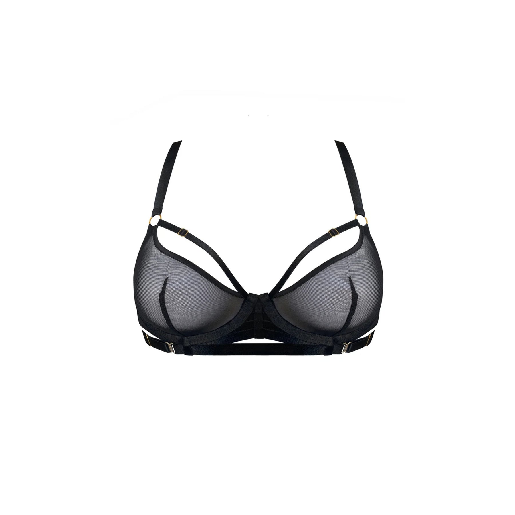 Balcony bra with underwire in transparent mesh finished with adjustable straps. The elastic detail at the front, fully adjustable straps, and the closure with 24k gold-plated zipper ensure a perfect look from every angle.