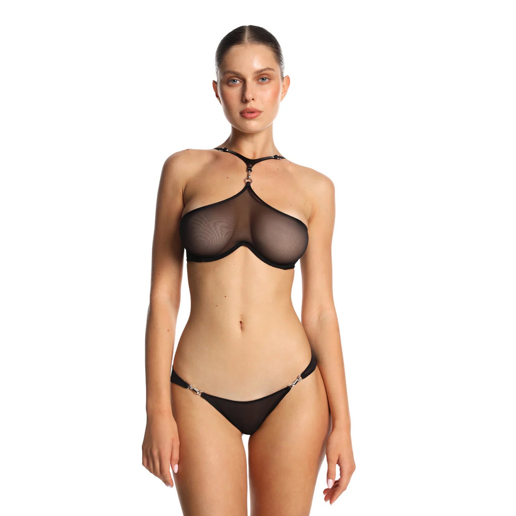 This bra is made of elegant transparent mesh with leather details under the collar. It has an inverted heart shape with underwire for better breast support. The leather detail is removable. Pair the Sandy bra with the mesh panties or briefs.