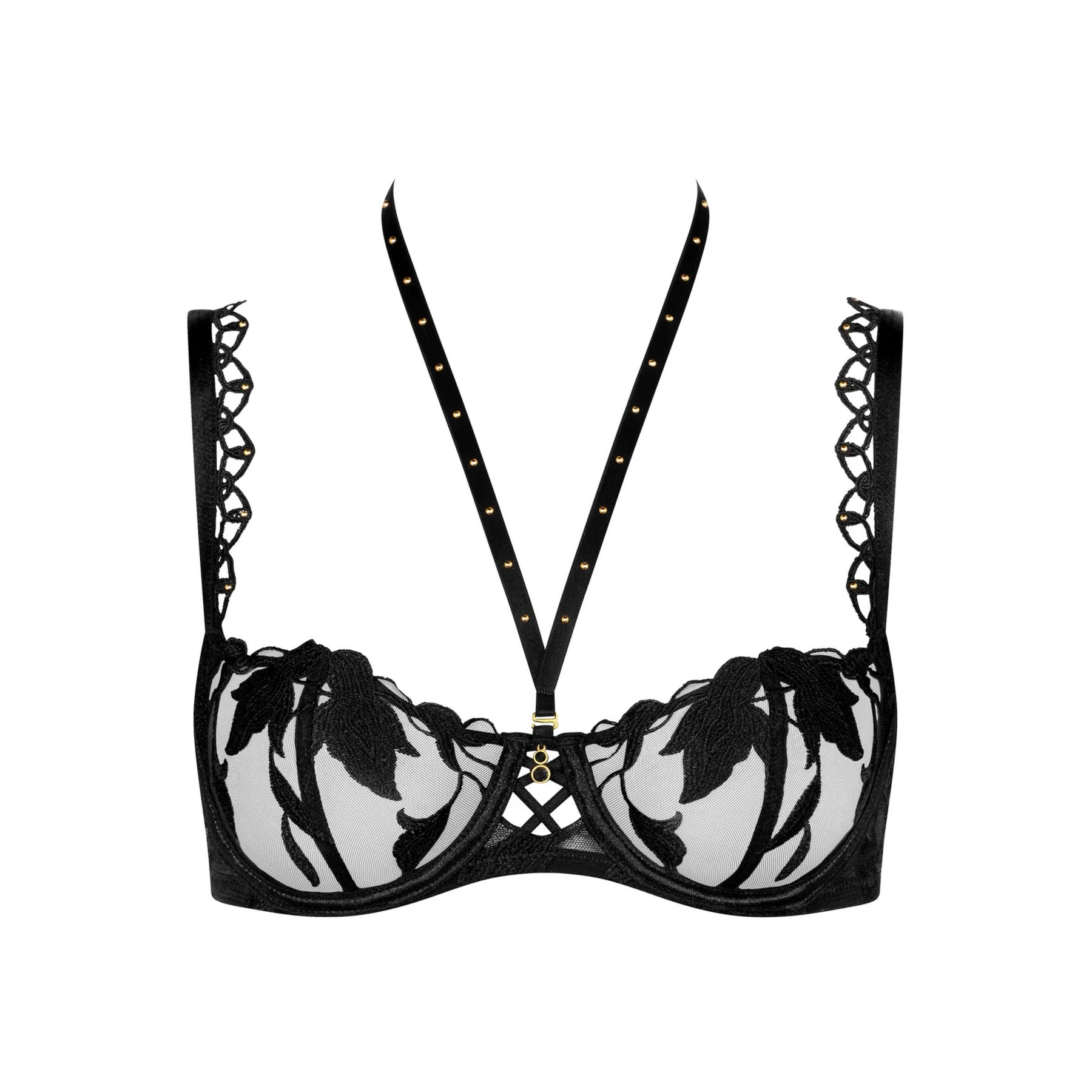Characterized by an open neckline adorned with beautiful floral embroidery, the Night At Paradise balconette bra with underwire is both comfortable and sexy at the same time. A detachable collar embellished with sophisticated golden studs extends between the cups and fastens behind the neck for a decidedly contemporary and bold effect.