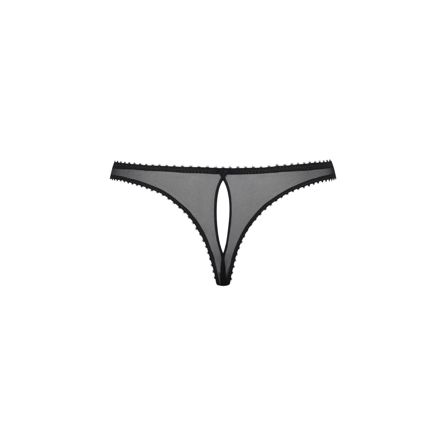 Open thong in recycled lace. The shape combines a rigid lace and transparent tulle edged with a picot elastic. Graphic cut and structured with two open sections crossing from the front to the back.