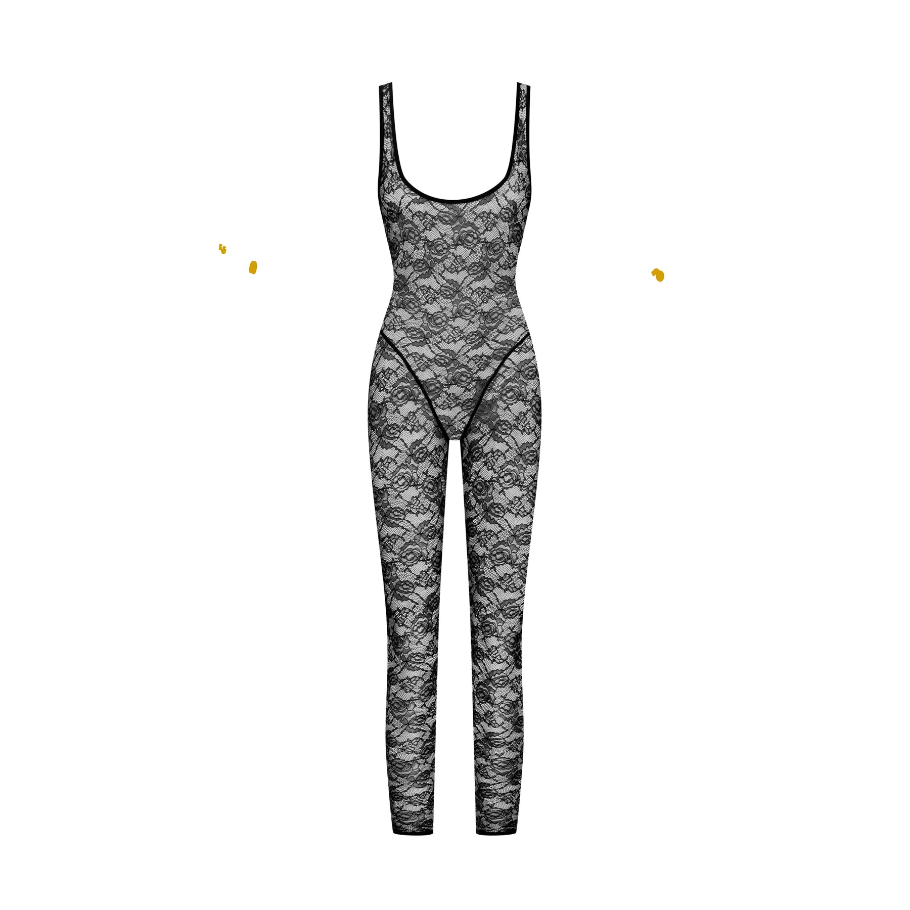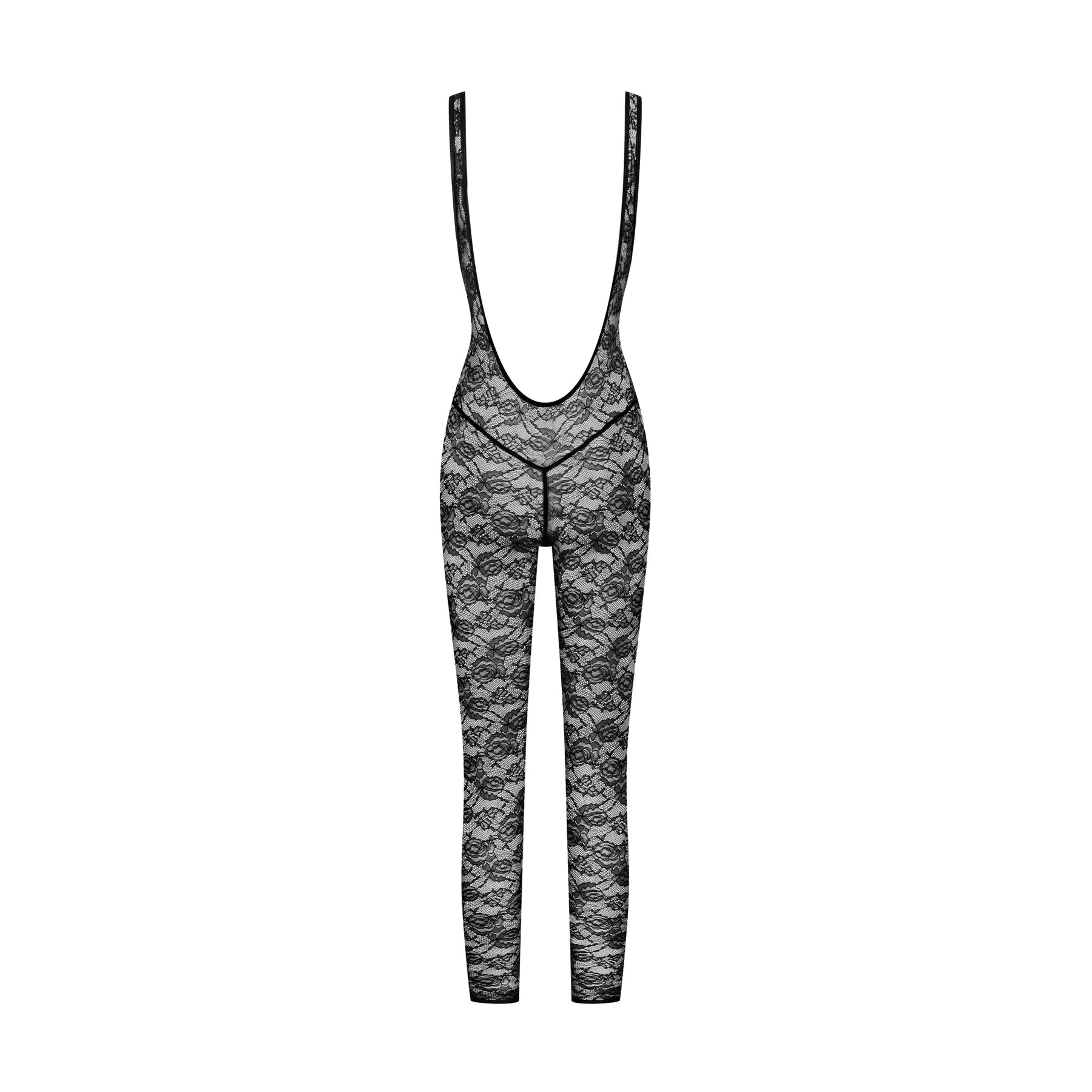 The catsuit with an open back is adorned with predominantly recycled lace. Fitted cut enhanced by a flat elastic. The neckline, the sleeveless armholes, and the dizzying open back take us back to the '80s.