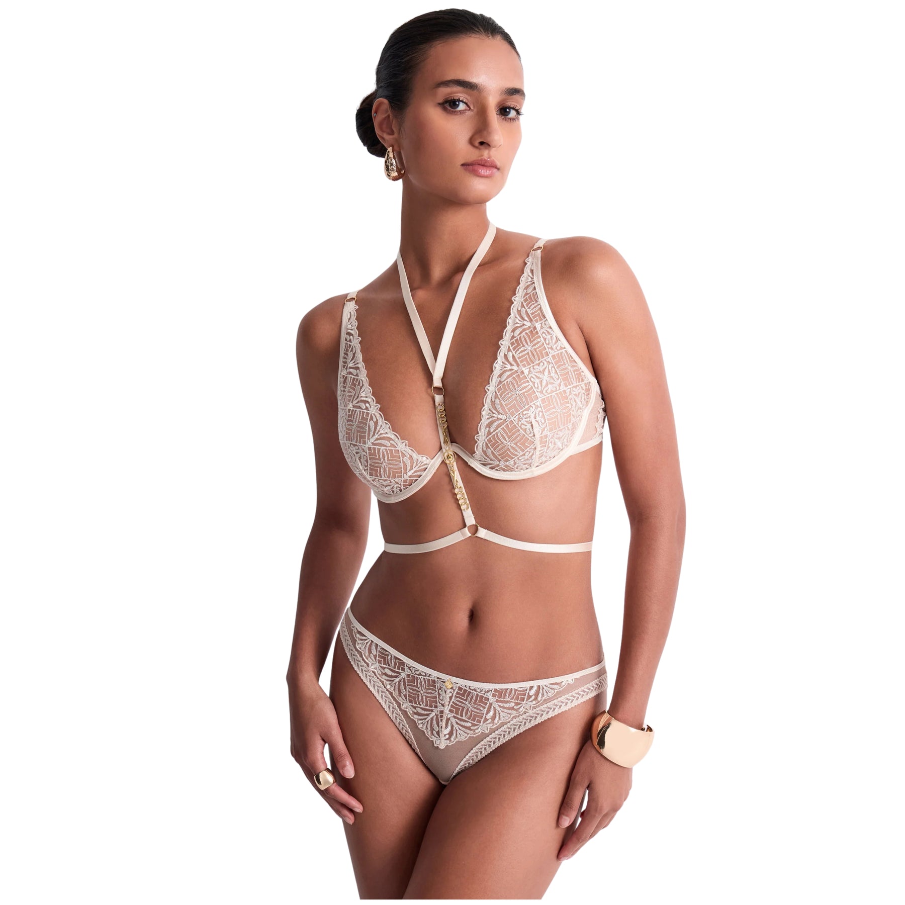 Elevate la seduzione al rango di arte con Iconic Calypso, una linea eccezionale in cui le ipnotiche grafiche dei ricami in raso e la brillantezza delle finiture dorate si combinano per scolpire la vostra silhouette in una luce unica e preziosa.
