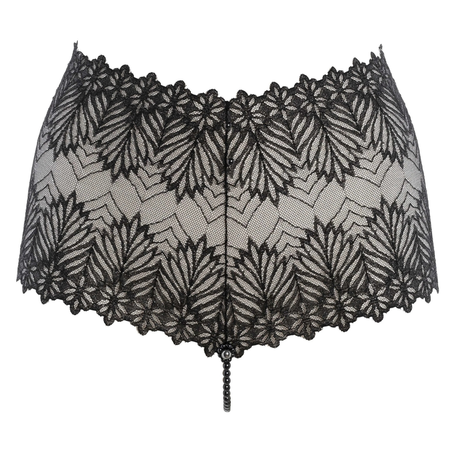 Destinos mutandina a vita alta è realizzata con delicato pizzo italiano con dettagli in lurex argento e perle nere.