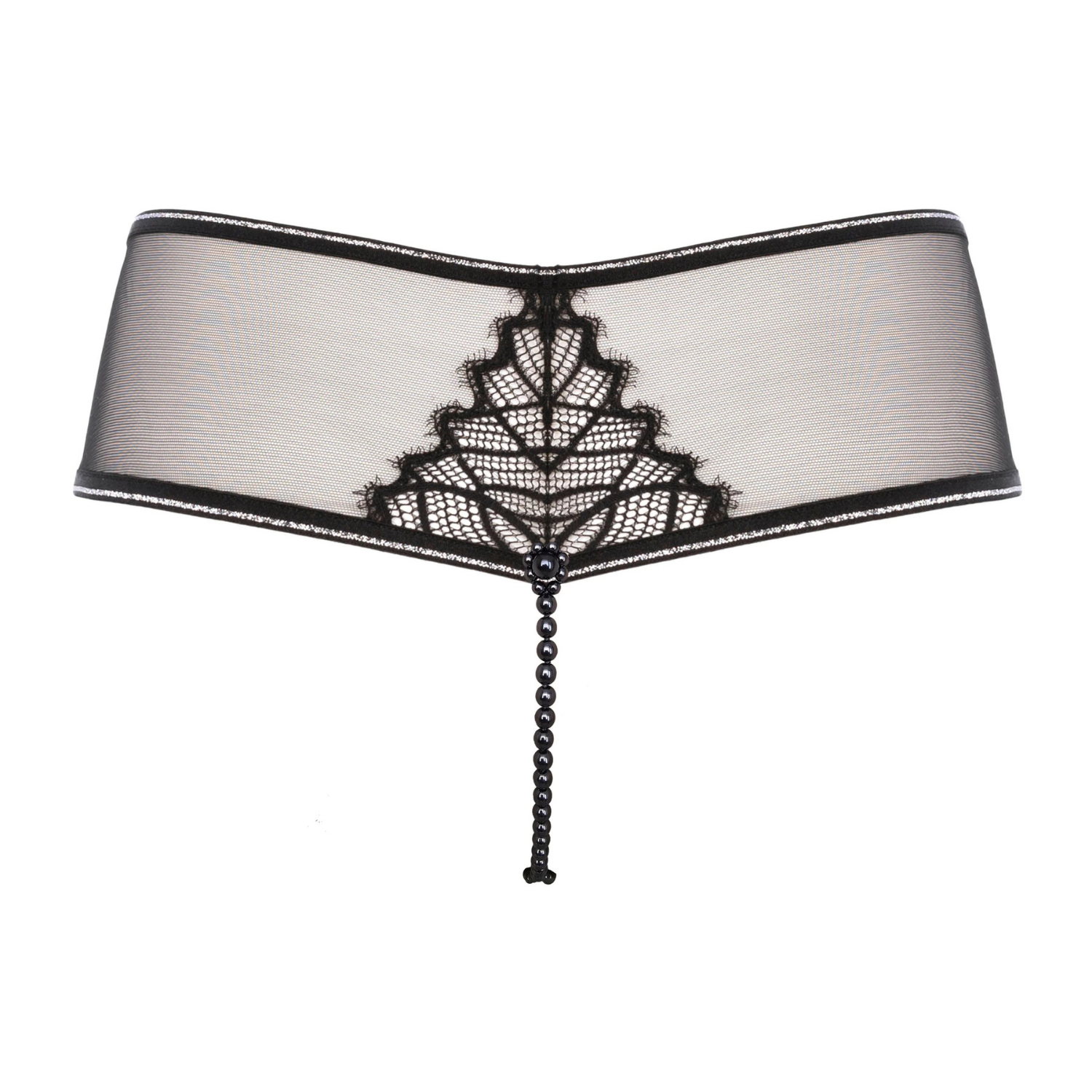 Manhattan mutandina con perle si distingue per il taglio a vita bassa e l'audace enfasi sul pizzo, sia sul davanti che sul retro. Abbinato al tulle ultra trasparente, questo modello crea un effetto visivo sorprendente sulla pelle, esaltando la silhouette femminile con uno spettacolare contrasto di texture.