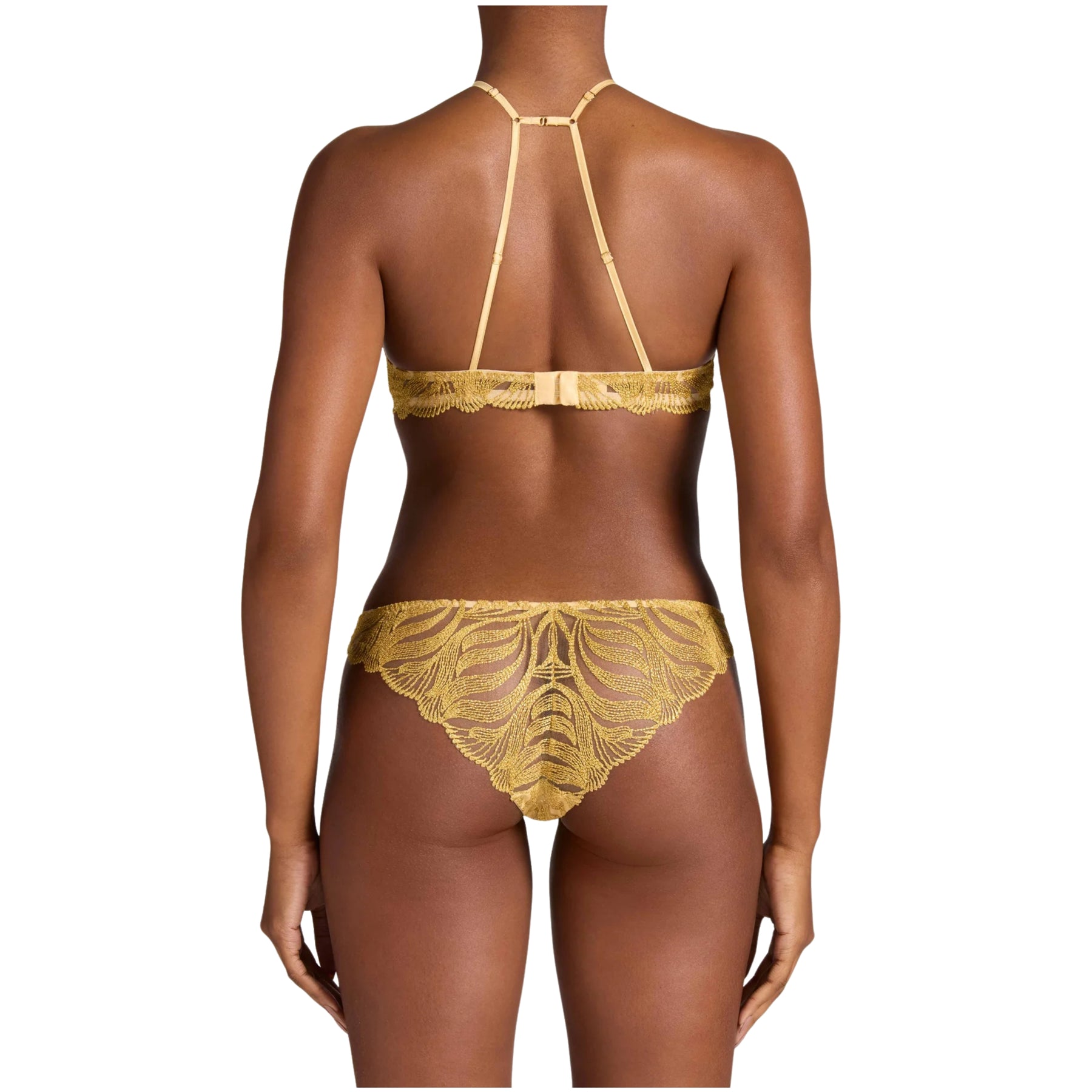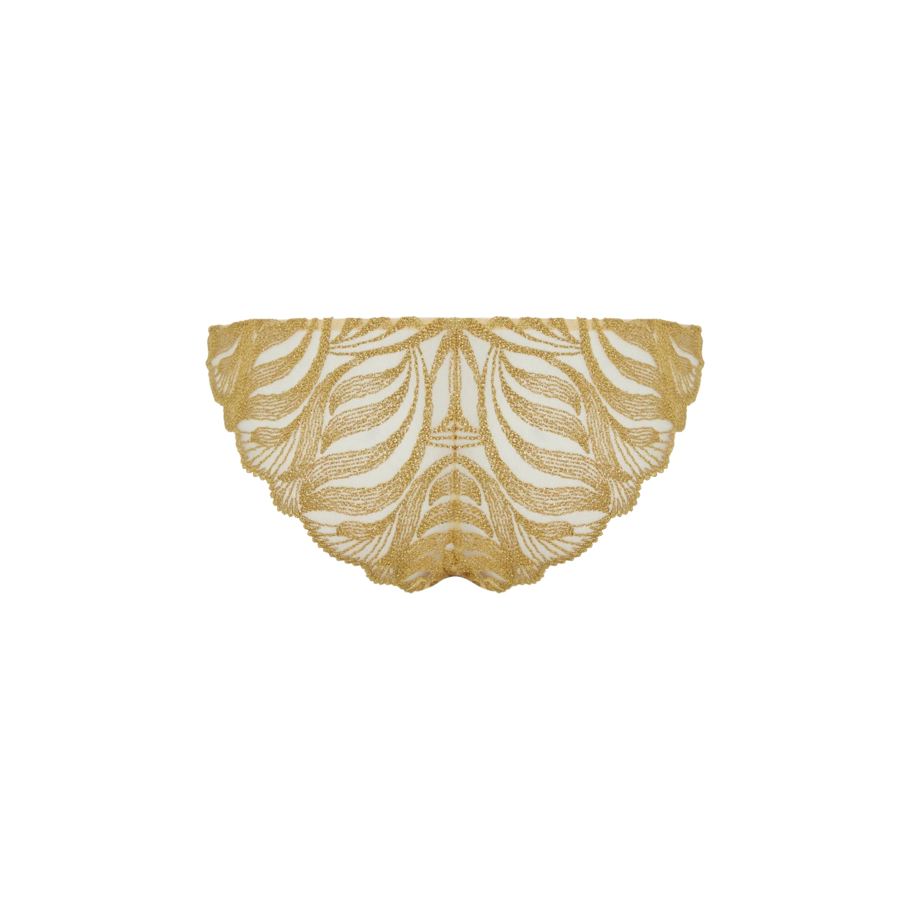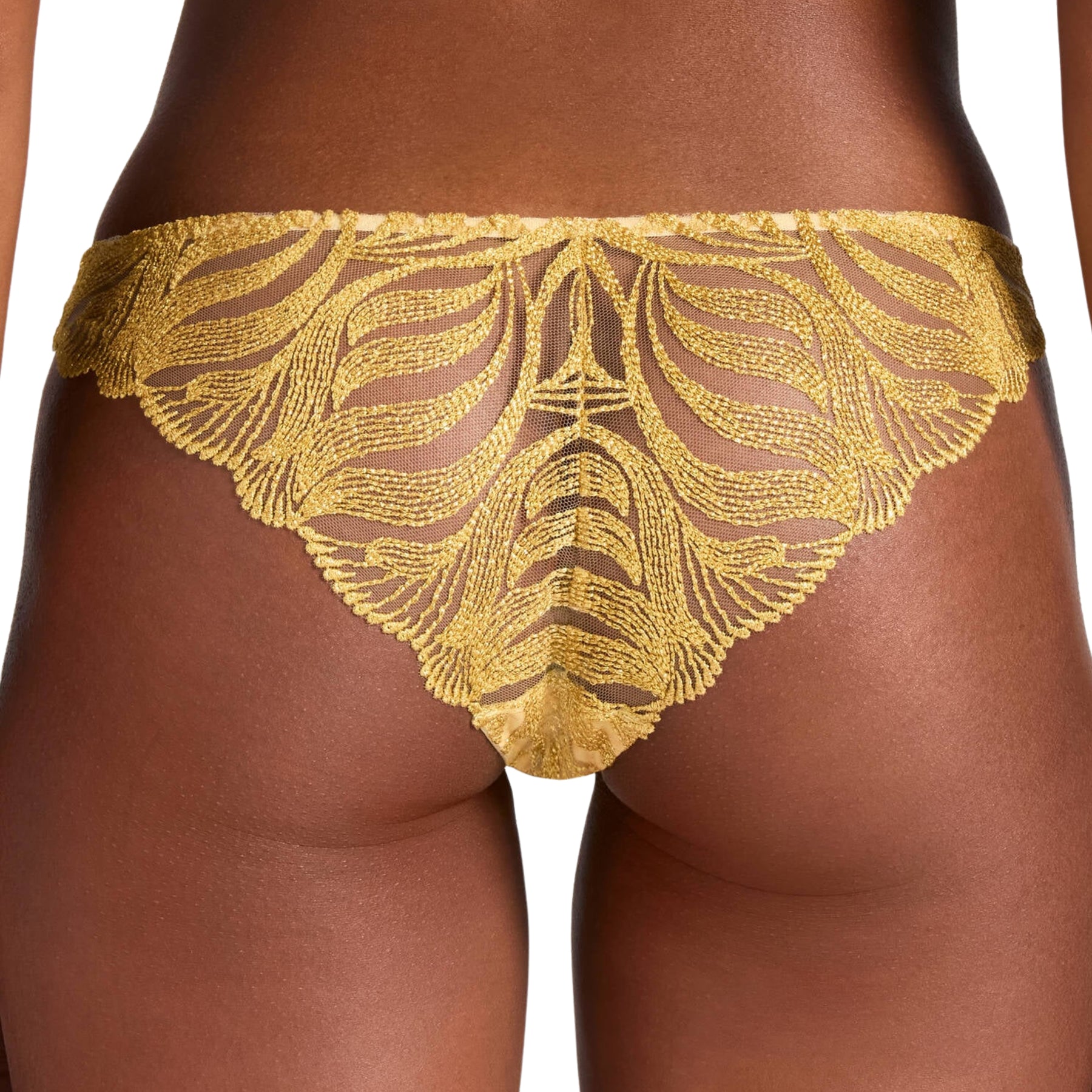Lo slip brasiliano Celeste incarna la raffinata sofisticatezza. Ricami in lurex dorato tracciano linee fluide e geometriche sul corpo, creando un luccichio radioso che mette in risalto ogni movimento.