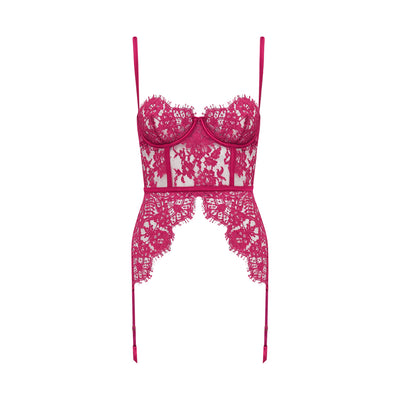 Il basque Zaria presenta una classica silhouette a balconcino con ferretto e un taglio alto ed elegante sotto la vita. I bordi smerlati con ciglia sulle coppe aggiungono ulteriore delicatezza al torace, mentre il rivestimento in filo di seta offre un leggero sollevamento, fondendosi con i pannelli di pizzo francese Leaver's in un ricco color ciliegia.