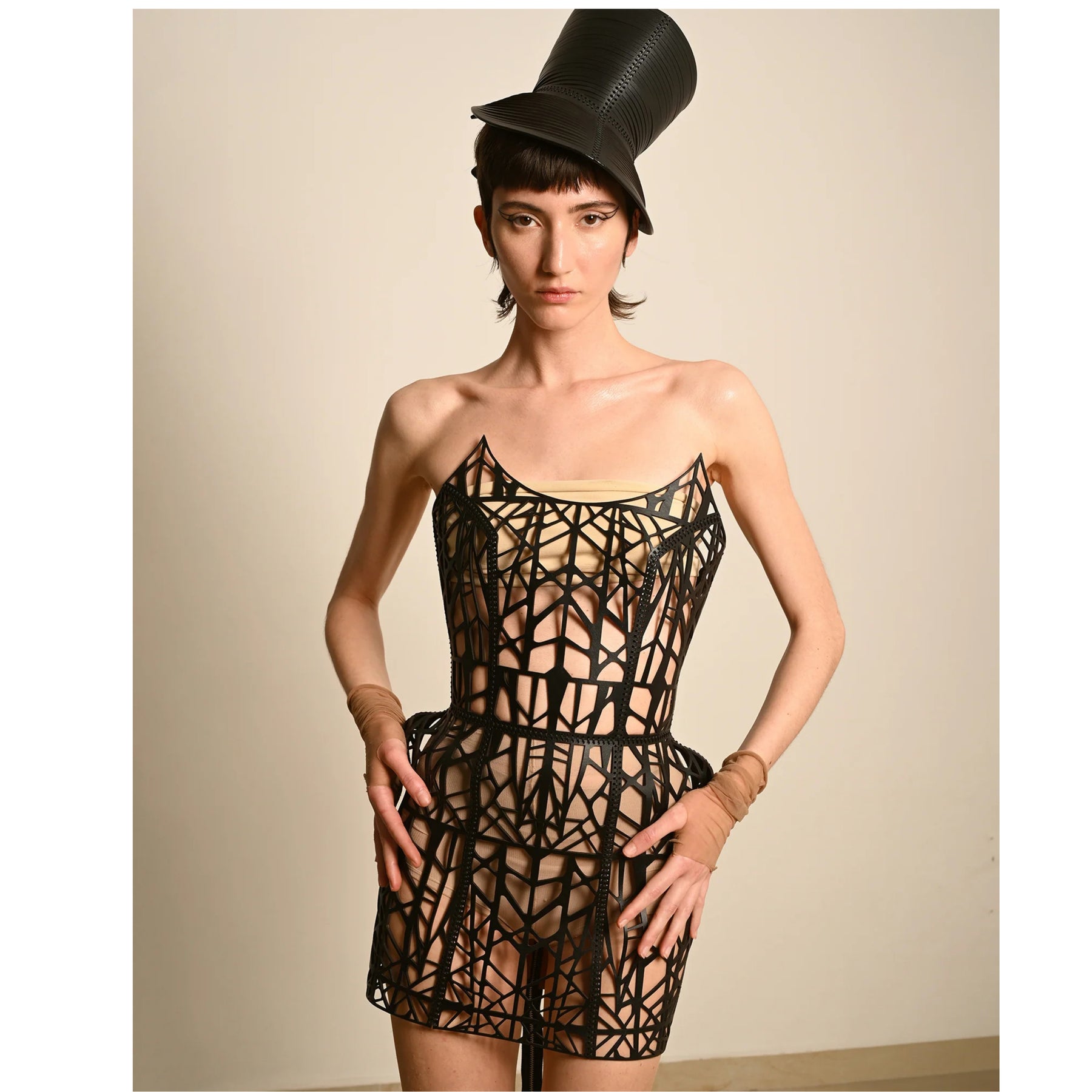 Questo abito scultoreo in pelle tagliata al laser gioca con le forme gotiche e l'illusione dell'architettura sacra. Asimmetrie organiche si scontrano con la disciplina simmetrica in una trama geometrica che incornicia il corpo come una struttura vivente. La scollatura dal taglio netto e l'orlo alto bilanciano delicatezza e forza, opacità ed esposizione.