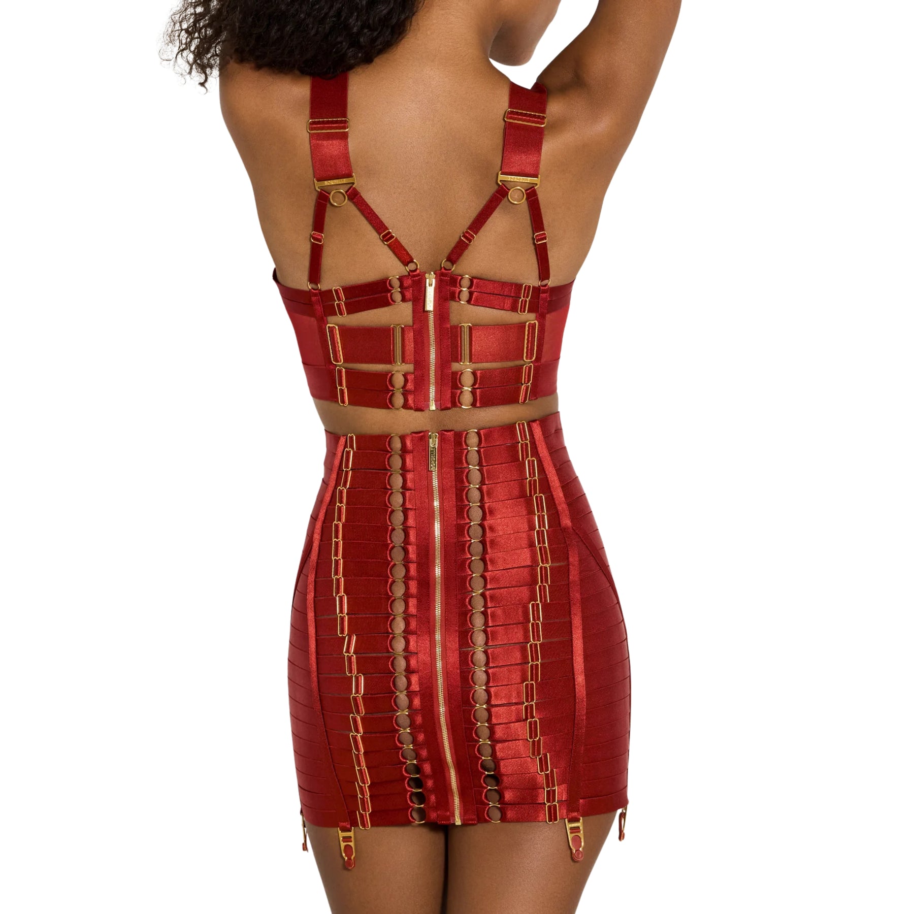 Waspie elasticizzato in raso firmato, progettato per modellare la silhouette con linee eleganti e una morbida fodera in mesh. Chiusura con zip firmata sul centro con elastici tra elasticizzati in raso completamente regolabili e componenti placcati in oro 24k.